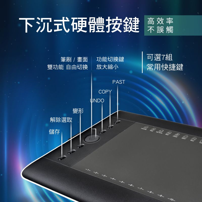 • 快捷按鍵:繪圖板左側上下兩側皆設有快捷按鍵,可自定義設定