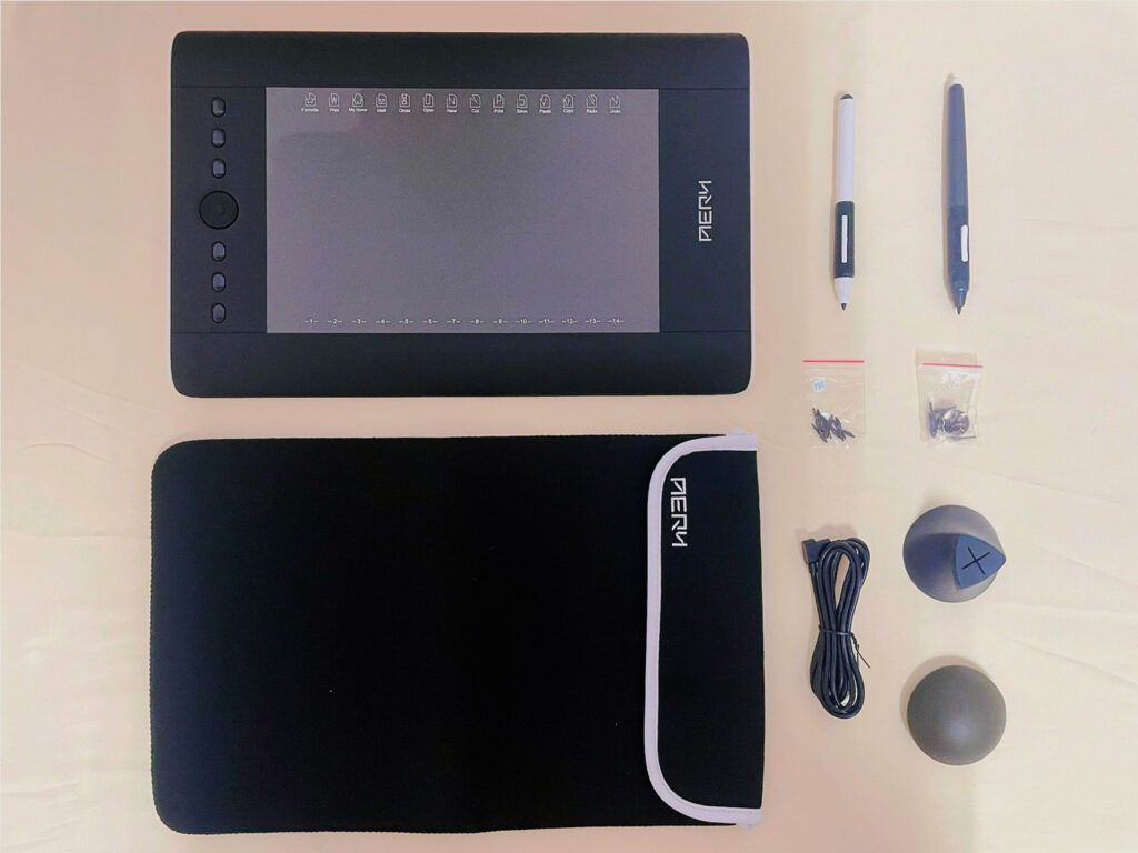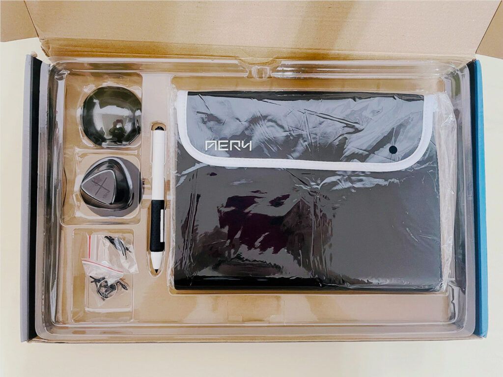 收到 AERY 十方機的第一眼,外箱設計簡潔俐落,拆開後內部分為兩層,上層是十方機本體,下層整齊排放著所有附贈配件。光是看到這一整套豐富的配件,就感覺這台機器的誠意十足——防水保護套、兩支壓感筆、不倒翁筆座、取筆器、10 顆筆心,比我預期的還要完整許多。