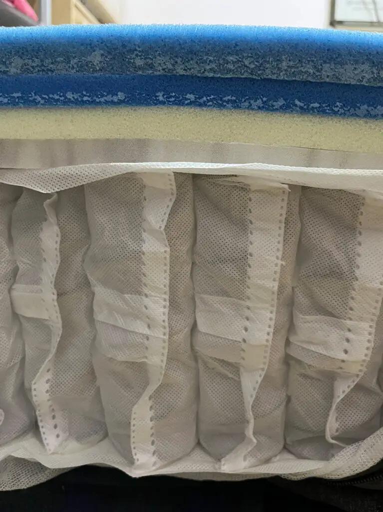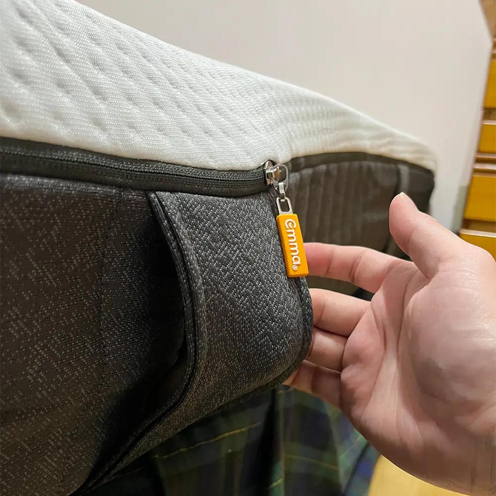 拆下外層布套仔細端詳,布料觸感細緻親膚,還有拉鍊可整件拆下清洗,非常實用。翻到床墊內部,可以清楚看到藍色記憶棉層中分布著細小的黑色石墨烯顆粒,雖然肉眼看起來數量不多,但實際使用後效果是有感的。