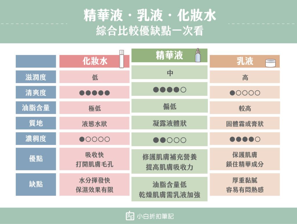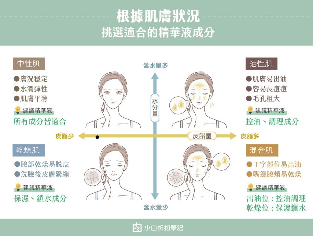 選購精華液前,最重要的第一步是確認自己的膚質類型與主要肌膚困擾。乾燥肌應優先挑選含玻尿酸、胺基酸、神經醯胺等高保濕鎖水成分的精華液,搭配乳液使用效果更佳;油性肌則應選擇含控油調理成分如米萃取、維他命B6、植酸等,並避開含高滋潤油脂成分如凡士林、乳油木果油的配方,以免加重出油問題;混合肌可針對T字部位與臉頰分別選用不同功效的精華液,靈活搭配;中性肌則可根據在意的問題如暗沈、細紋等選擇對應成分。